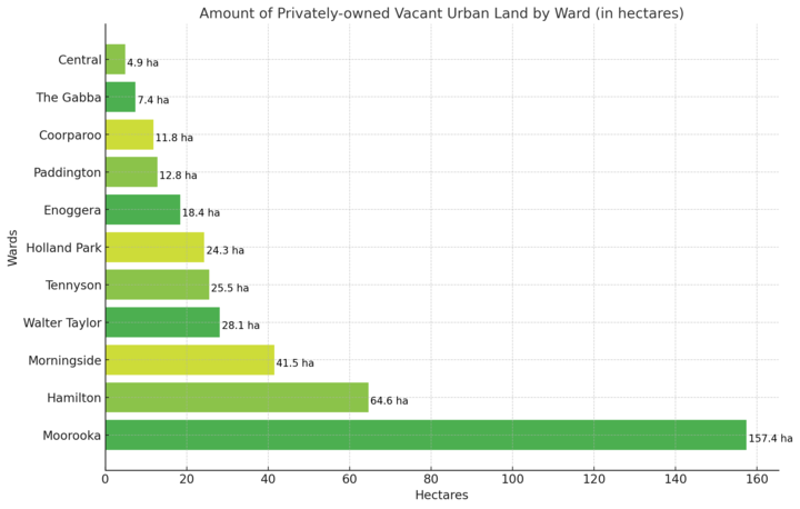 (2) There is 3.9km2 of privately owned vacant urban land in the 11 Council Wards of Central, Coorparoo, Enoggera, Hamilton, Holland Park, Moorooka, Morningside, Paddington, Tennyson, The Gabba and Walter Taylor.